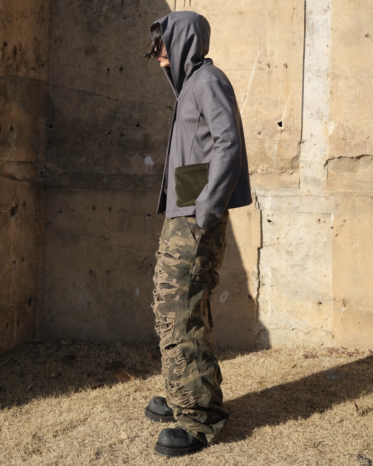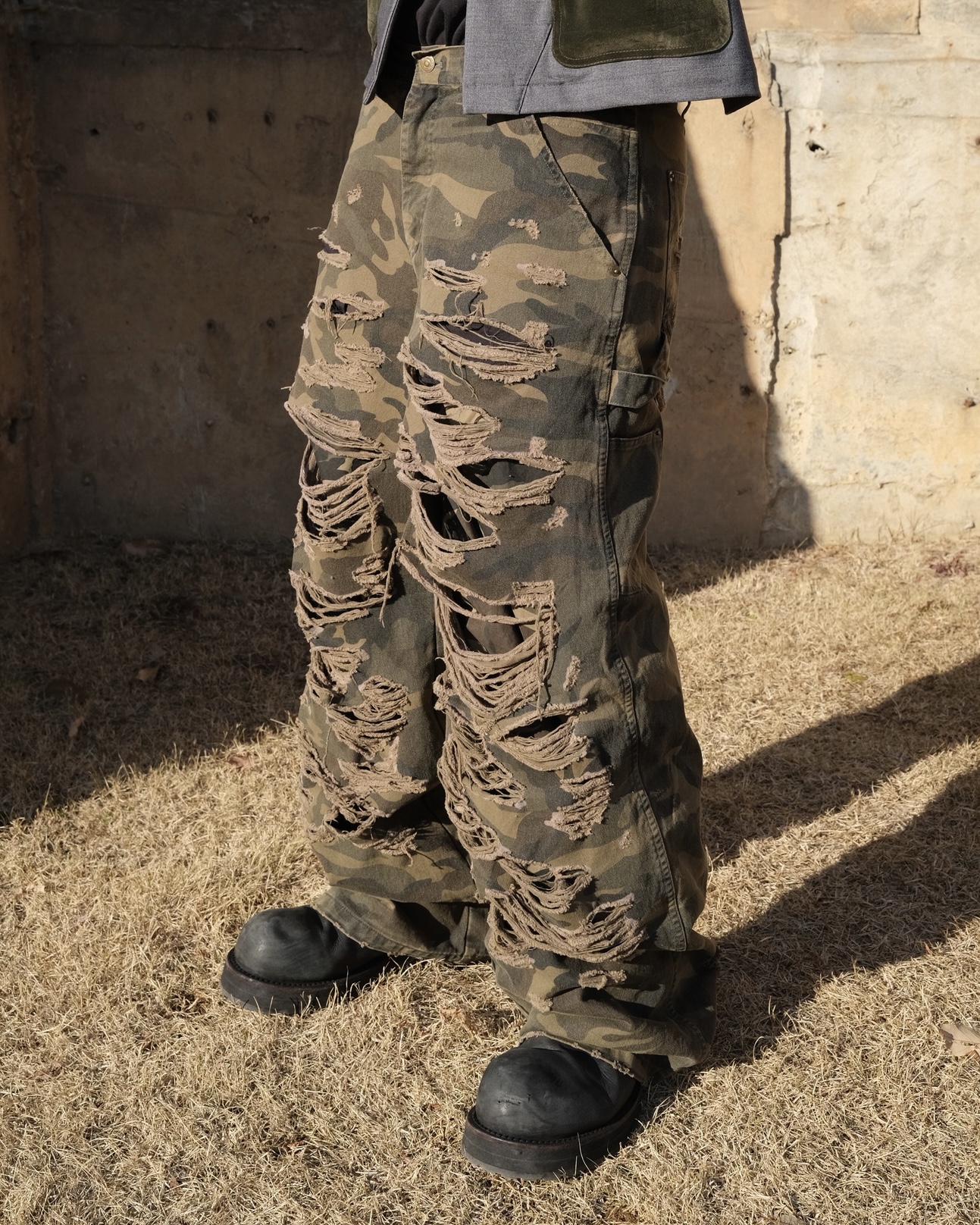 DOUBLE LAYERED DISTRESSED CAMO PANTS - WOODLAND CAMO